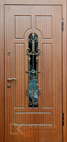 Фото «Стальная дверь под светлый дуб со стеклянной вставкой и ковкой №19»